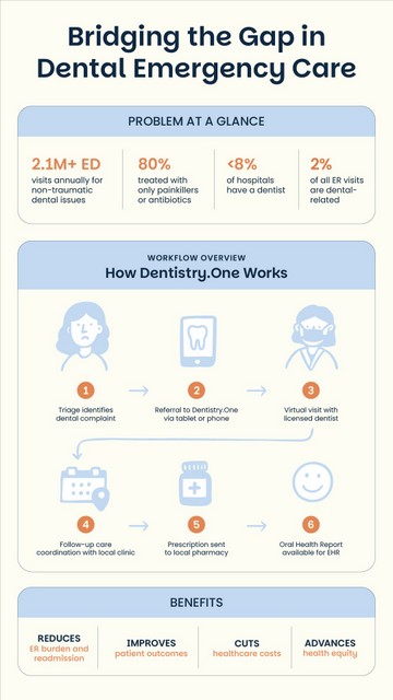 The solution is access to a dentist at any time or from anywhere. This is accomplished via a scalable virtual-first dental care platform that can help hospitals, particularly those in rural and underserved areas, divert low-acuity dental emergencies from crowded EDs to qualified dental providers, improving outcomes while reducing costs.